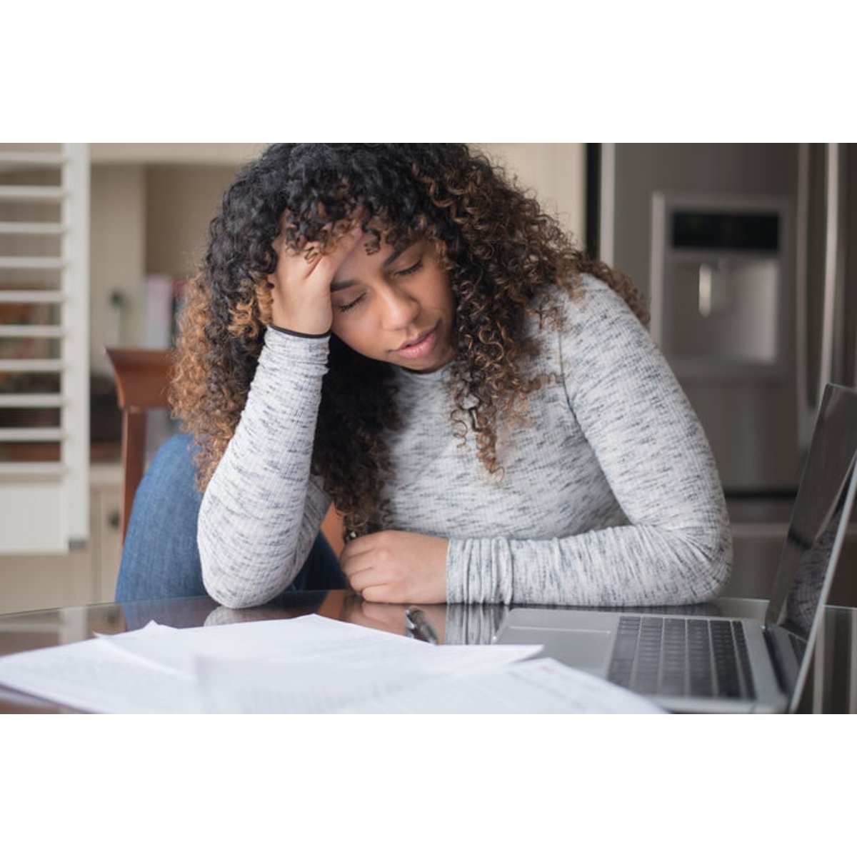 A woman looking worried, at a table with papers and a laptop.